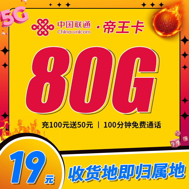 联通帝王卡19元80G+100分钟归属地:本地不发地区:以运营商审核为准备注:-配送方式:人工上门激活方式:-首充渠道:任意渠道一次性充值100元办理年龄:18-60岁违停复机:-套餐合约:无合约套餐构成:首月按天折算计费,第2-6个月19元/月,第 7个月开始恢复29元/月;80G全国流量+100分钟通 话一年有效,到期恢复原套餐注销方式:支持异地注销、当地营业厅注销、中国联通APP线上注销