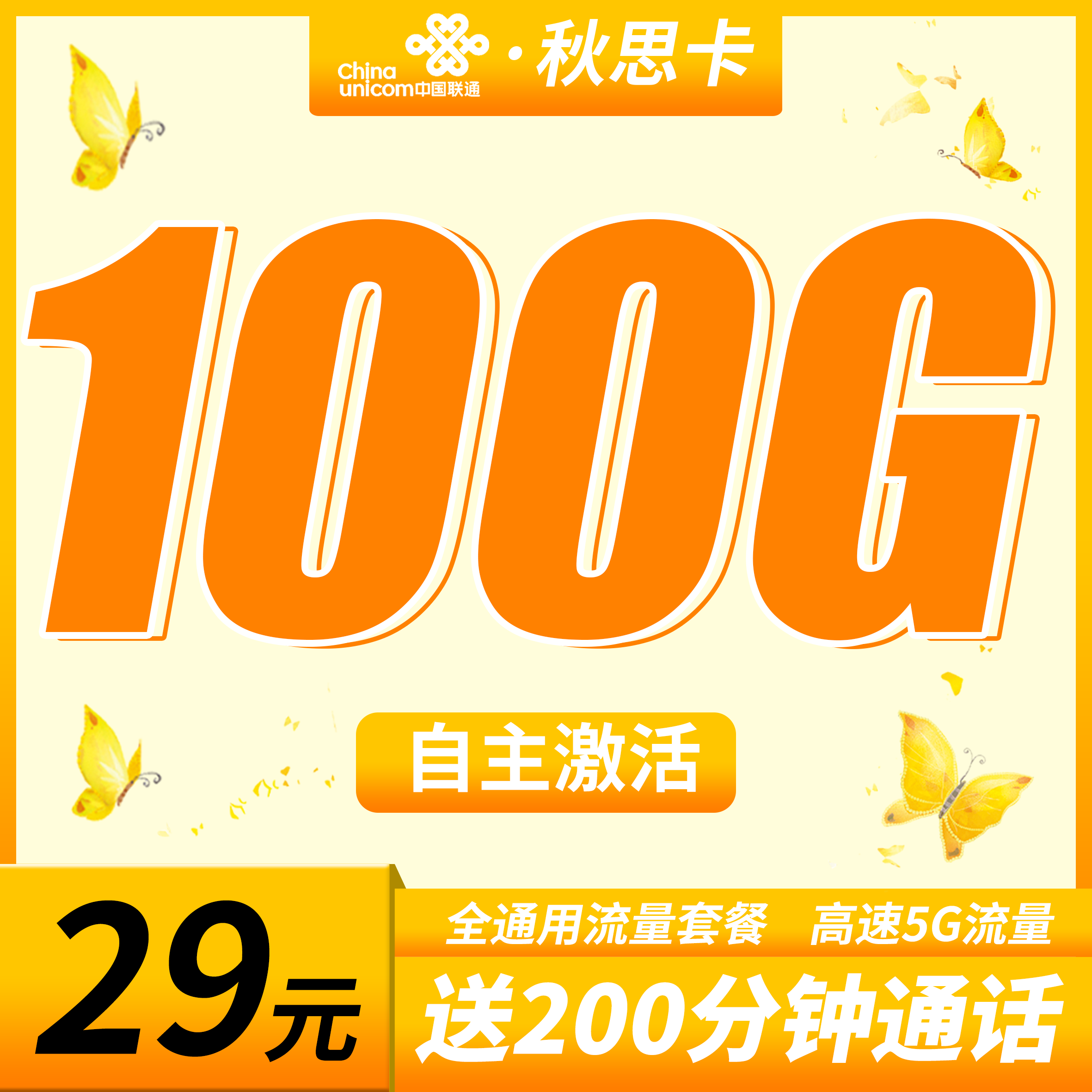 联通秋思卡29元100G+200分钟+全通用流量套餐!