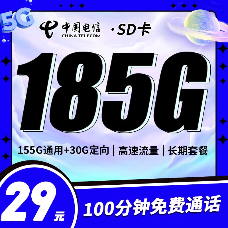 电信SD卡29元185G+100分钟套餐构成首月免费,流量为80G按天折算;之后每月29元;激活30天后流量叠加至185G+100分钟,叠加套餐长期有效归属地随机不发地区北京、西藏、新疆、云南及其他运营商动态拦截地区配送方式京东/顺丰激活方式自助首充渠道激活时强充值100元办理年龄20-60岁违停复机-套餐合约无合约注销方式支持异地注销、当地营业厅注销、中国电信APP线上注销