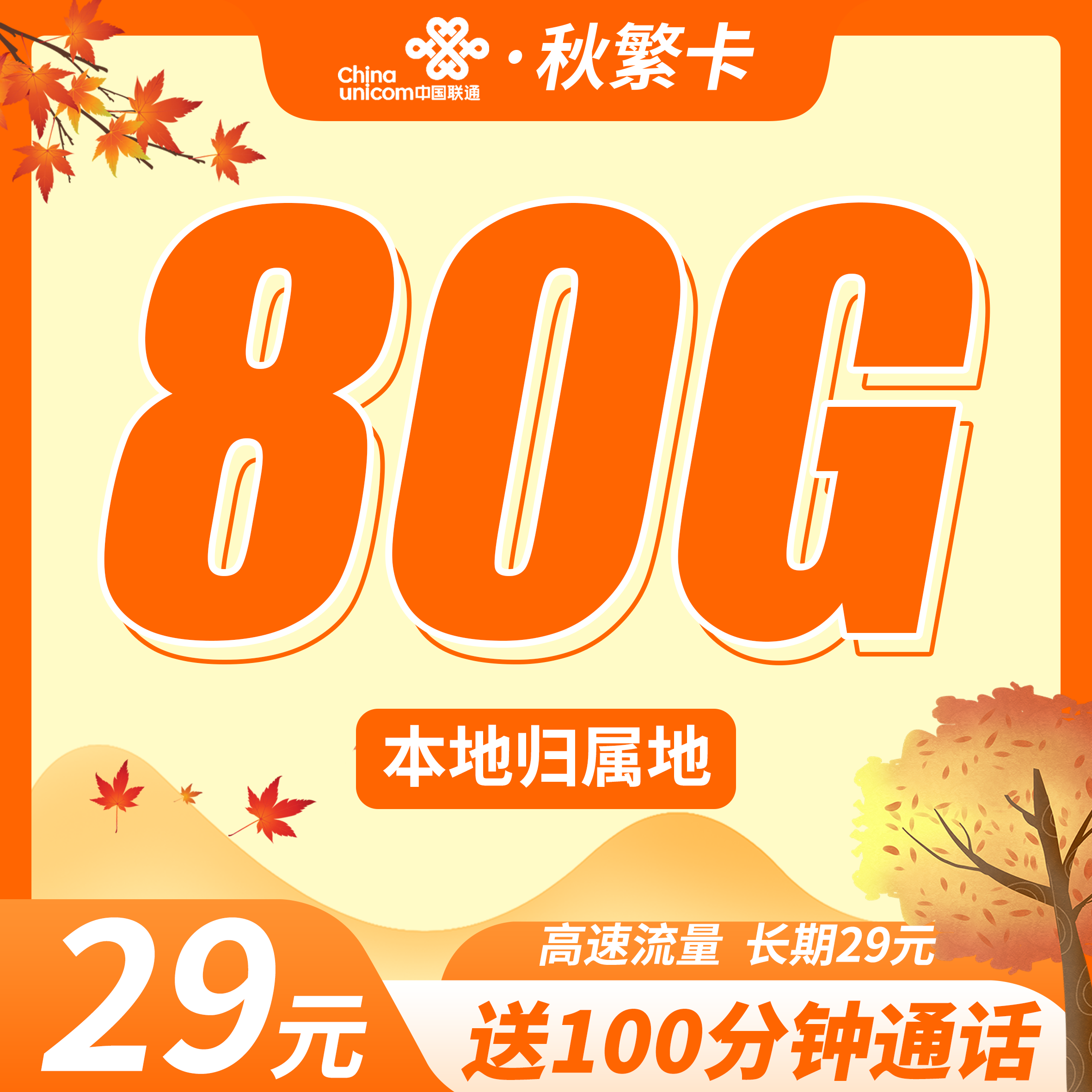 联通秋繁卡29元80G+100分钟+本地归属地!